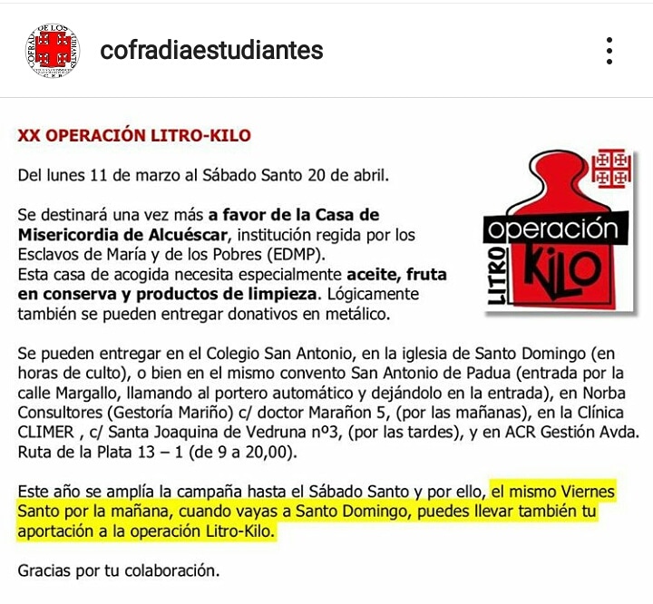 Este año como novedad y dentro de la Operación kilo-litro, el día de nuestra procesión, podrás llevar, a parte de tu túnica, tus recuerdos y tu fe, un kilo-litro de comida para atender a las necesidades de los que más sufren. "Tuve hambre y me distes de comer". "Tuve sed y me distes de beber". Comparte.